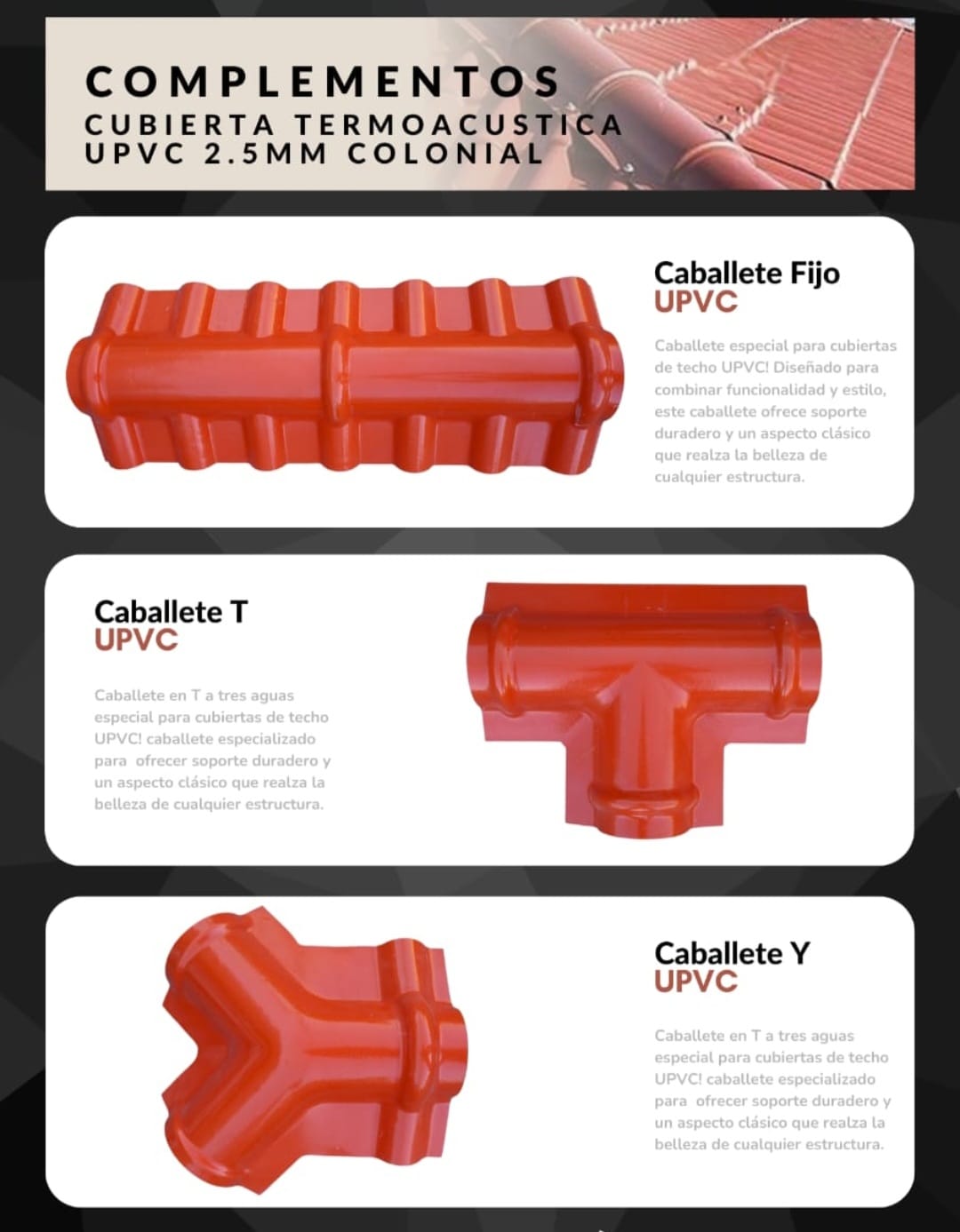 Fabricada en UPVC termoacústico de alto desempeño, diseñada con estética tipo teja colonial.